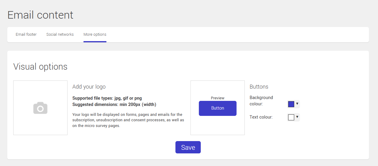 Add your company logo to display on default pages generated by the application and automated emails for subscriptions, unsubscription and consent confirmation.
